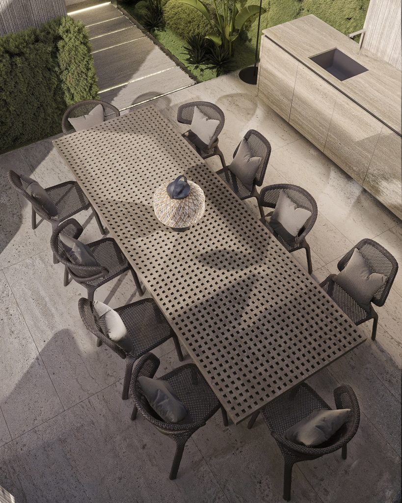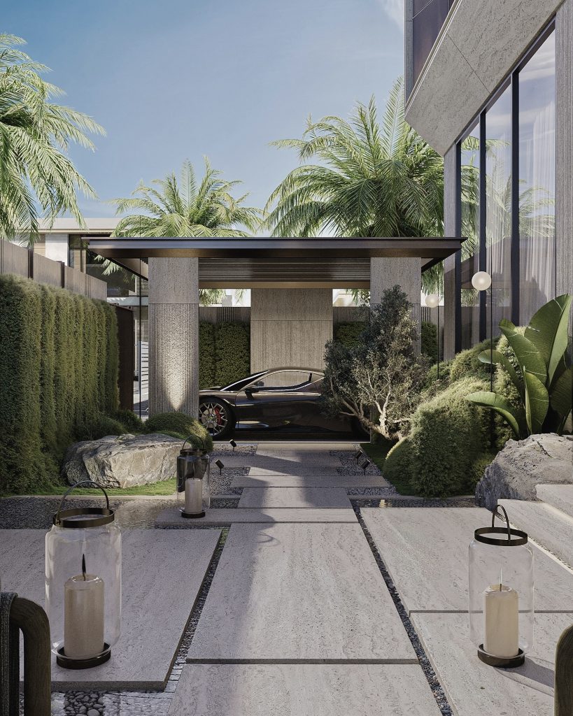 The entrance unfolds as a grand yet inviting gesture, framed by lush greenery and minimalist lighting. Beyond the walls, the outdoor courtyard becomes the soul of the residence — an intimate gathering space with lounge seating, fire accents, and a shaded dining pavilion that seamlessly blends comfort with sophistication.- YEAR: 2025