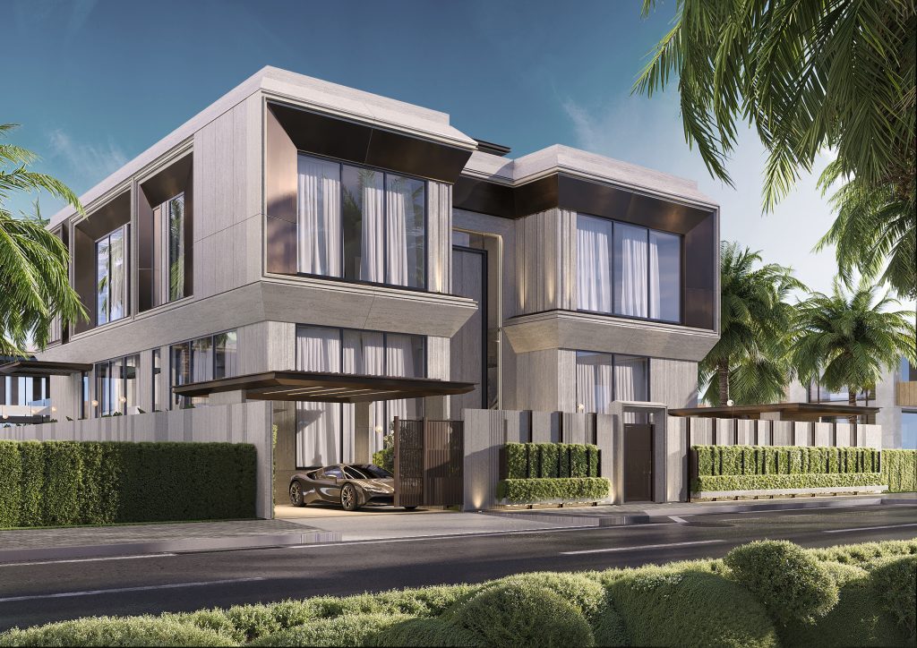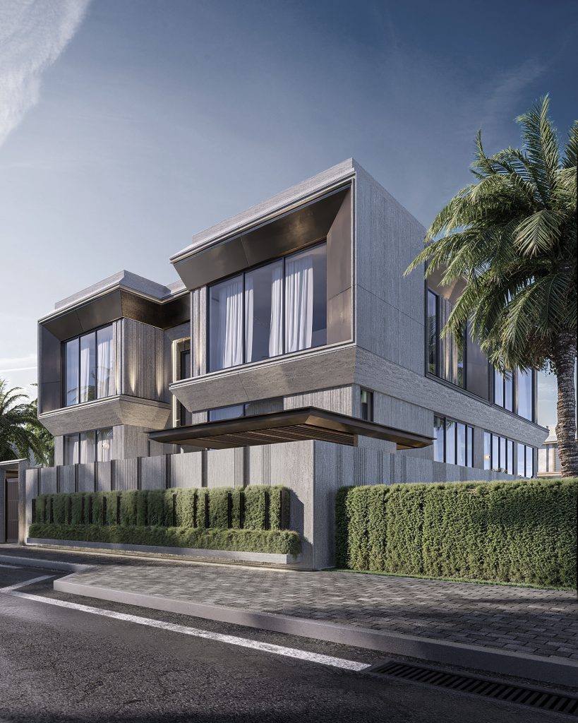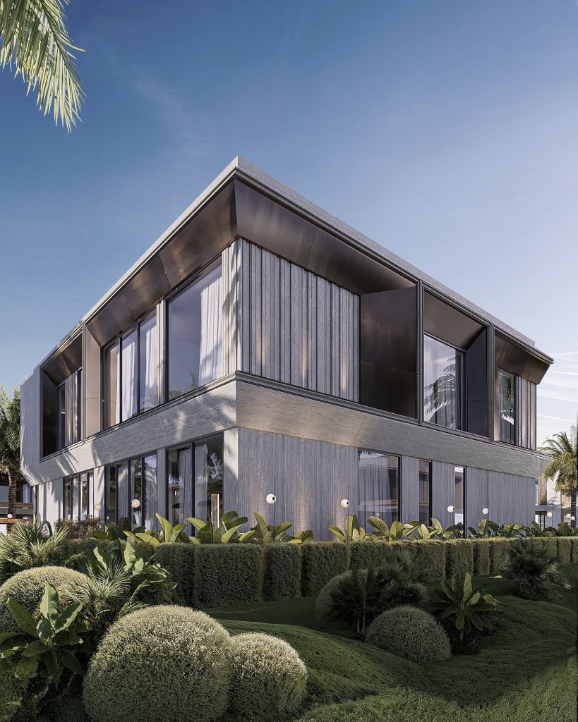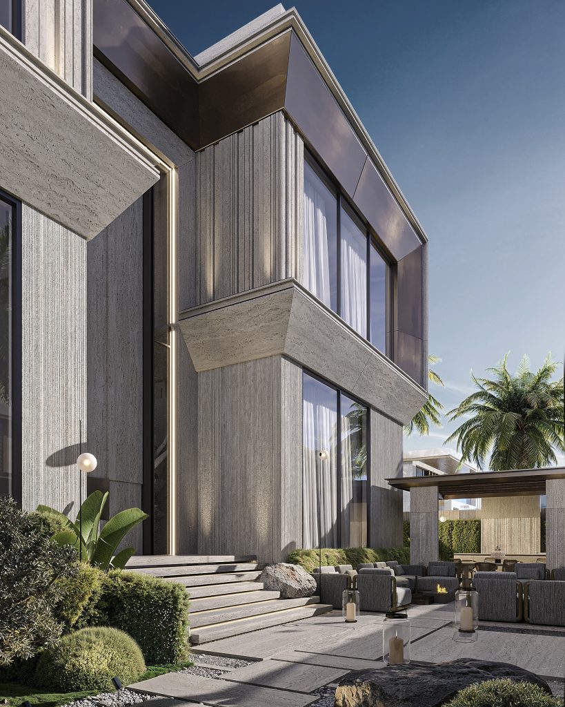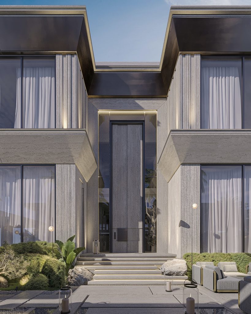 The façade is sculpted with bold lines and expansive glazing, creating a rhythm of light and shadow that highlights the architectural form. Natural stone cladding and bronze-toned details bring warmth and sophistication, balancing strength with elegance.
