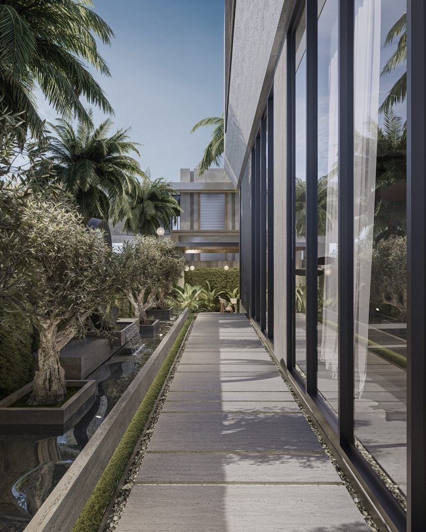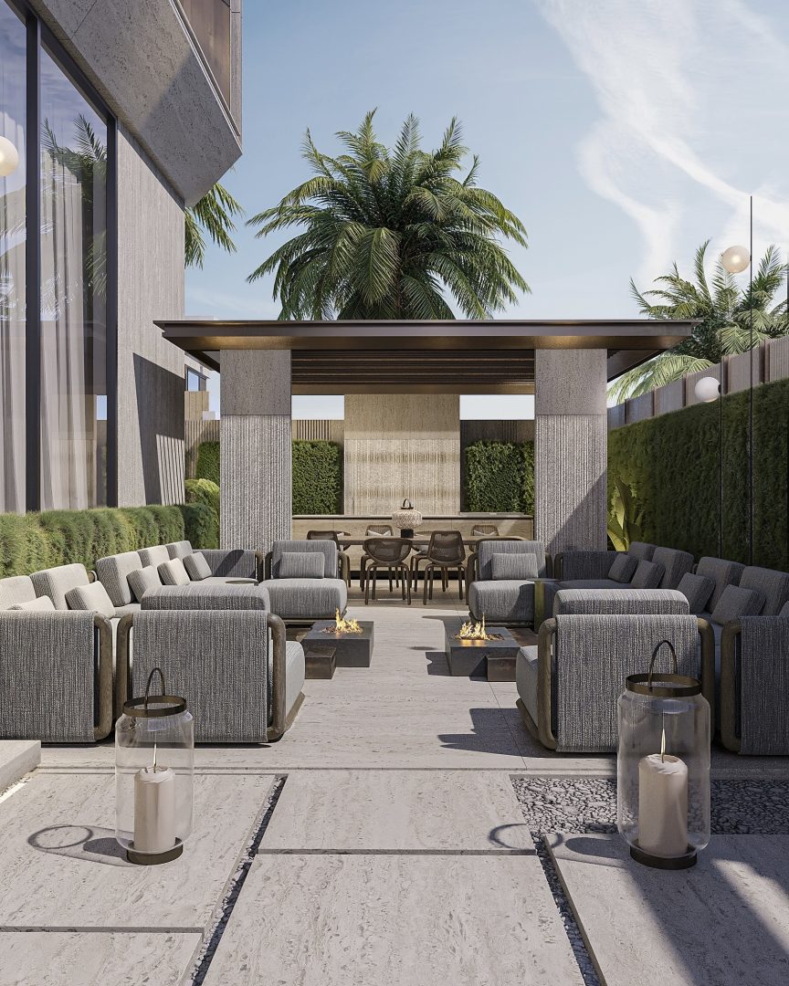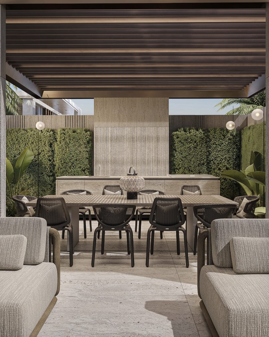 The entrance unfolds as a grand yet inviting gesture, framed by lush greenery and minimalist lighting. Beyond the walls, the outdoor courtyard becomes the soul of the residence — an intimate gathering space with lounge seating, fire accents, and a shaded dining pavilion that seamlessly blends comfort with sophistication.- YEAR: 2025