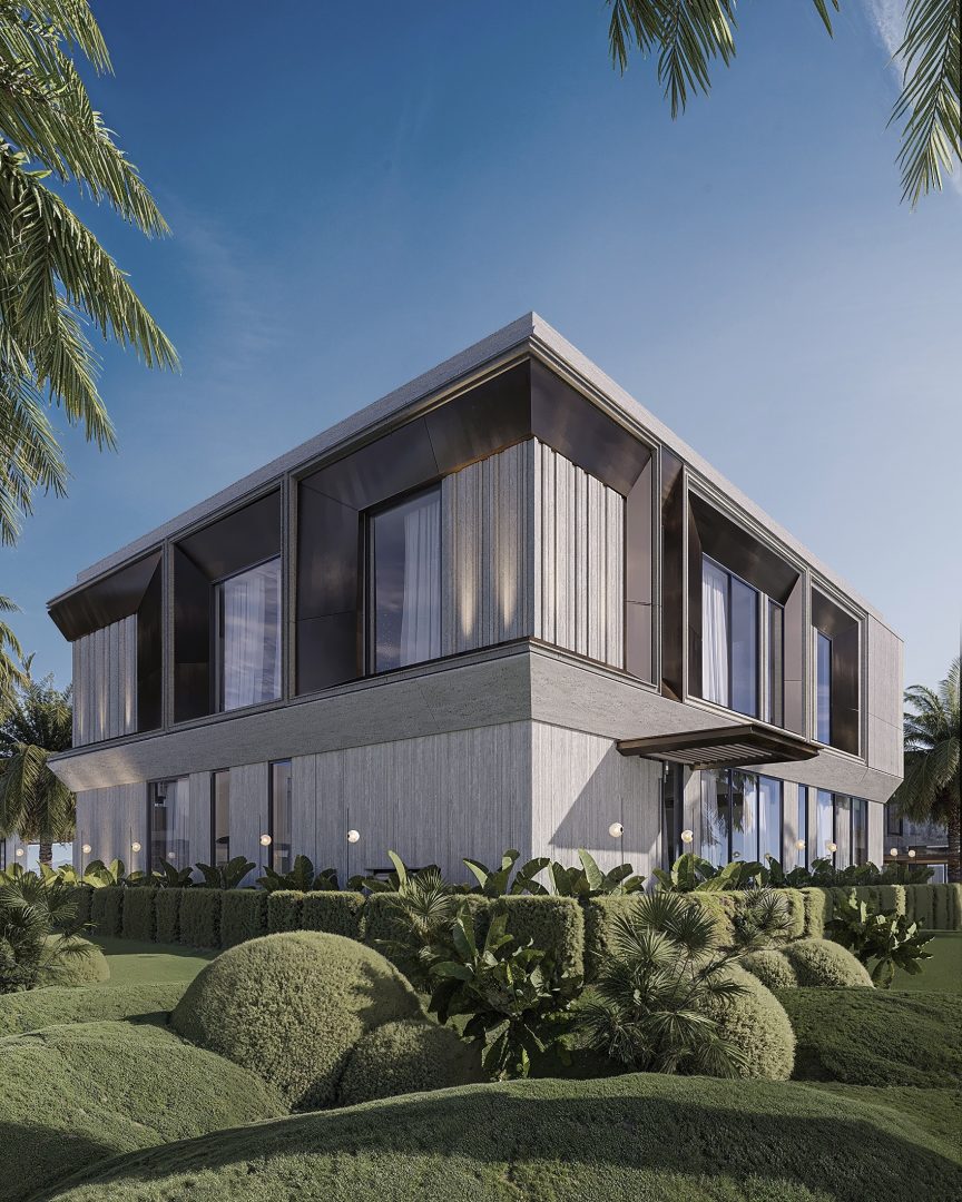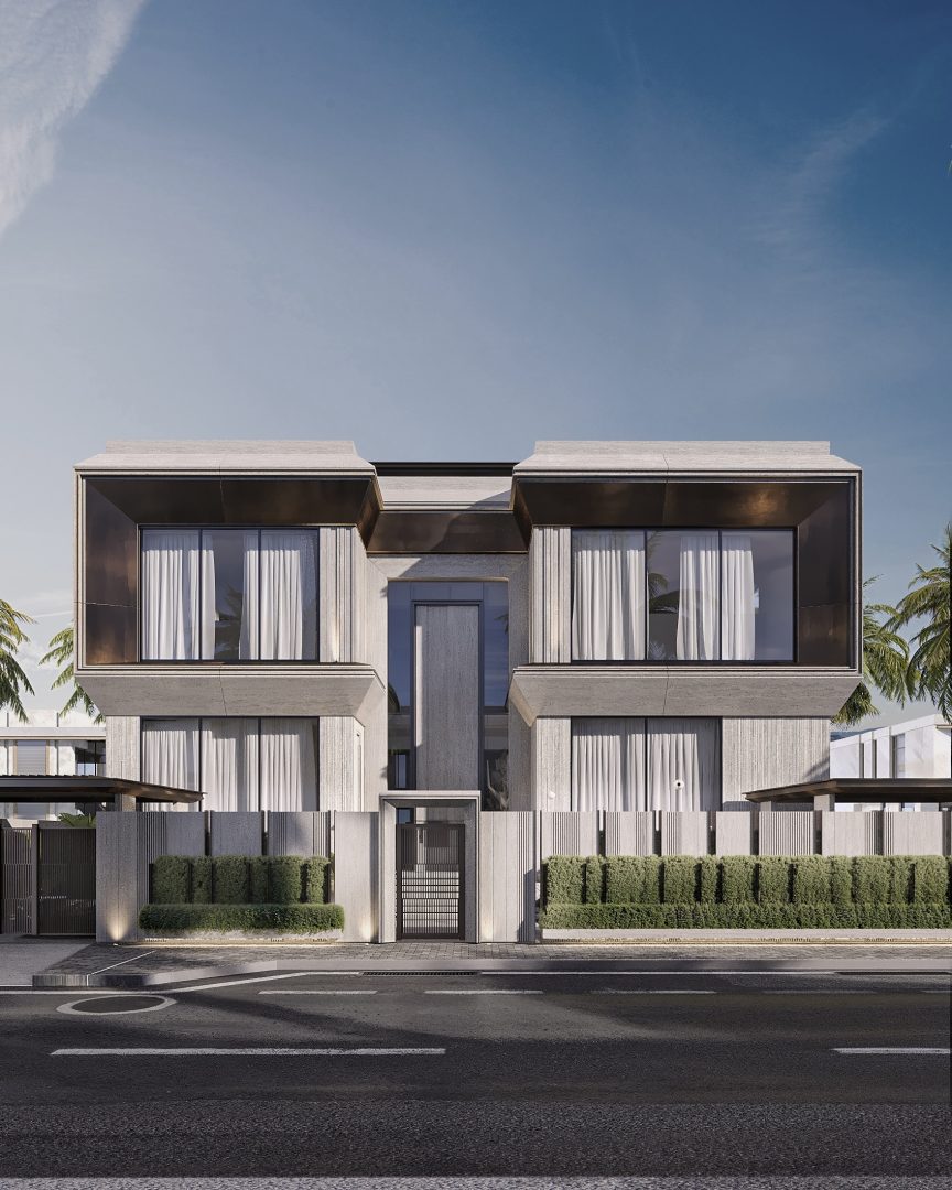 The façade is sculpted with bold lines and expansive glazing, creating a rhythm of light and shadow that highlights the architectural form. Natural stone cladding and bronze-toned details bring warmth and sophistication, balancing strength with elegance.