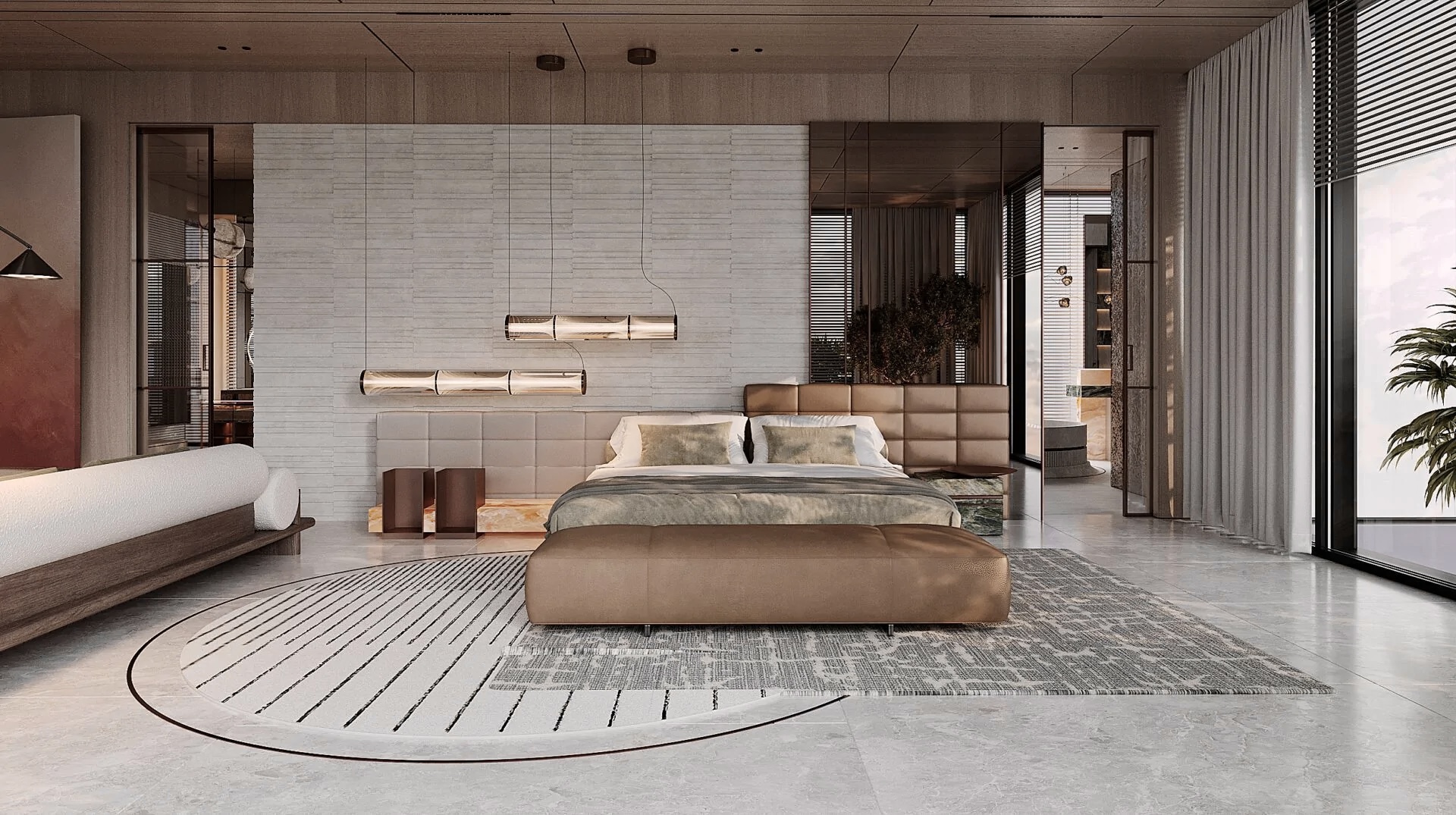 This master bedroom design exudes a modern and luxurious atmosphere, combining a soothing palette of neutral tones with elegant textures. The centerpiece of the room is a large, low-profile bed with a padded headboard in soft beige, which complements the earthy tones of the bedding and the cushioned bench at the foot of the bed.