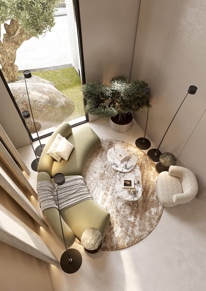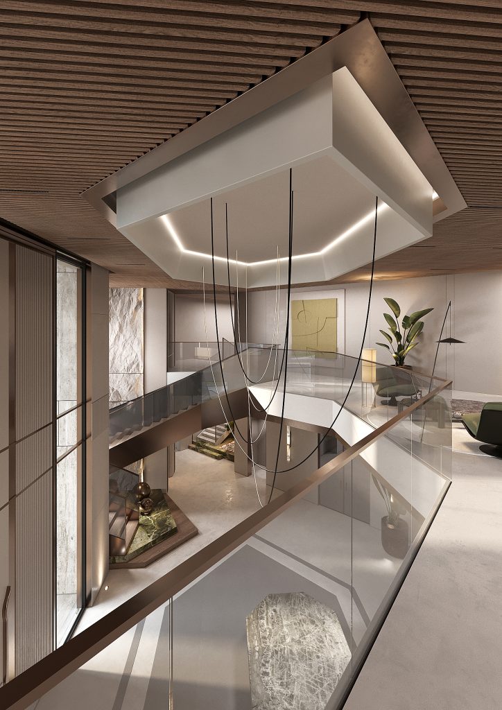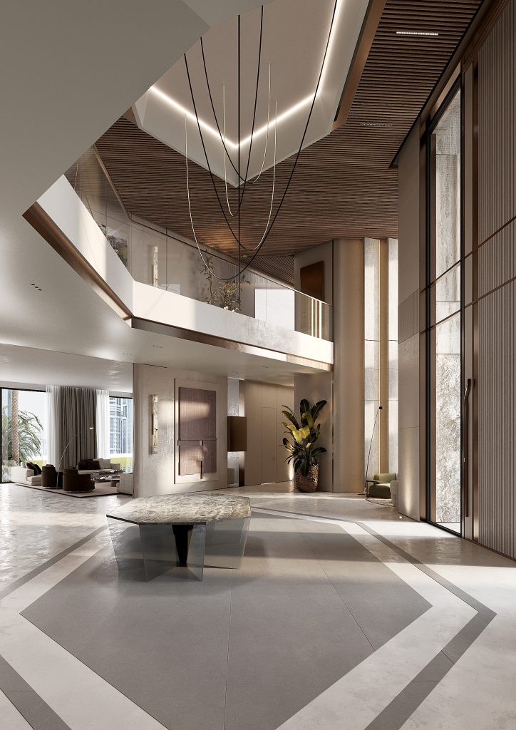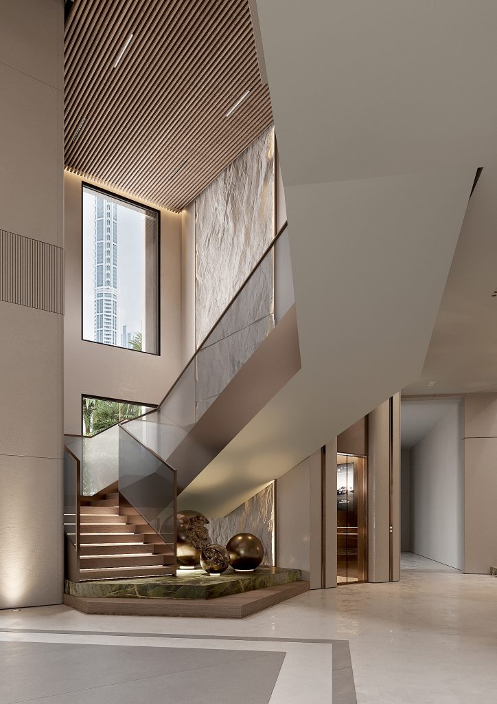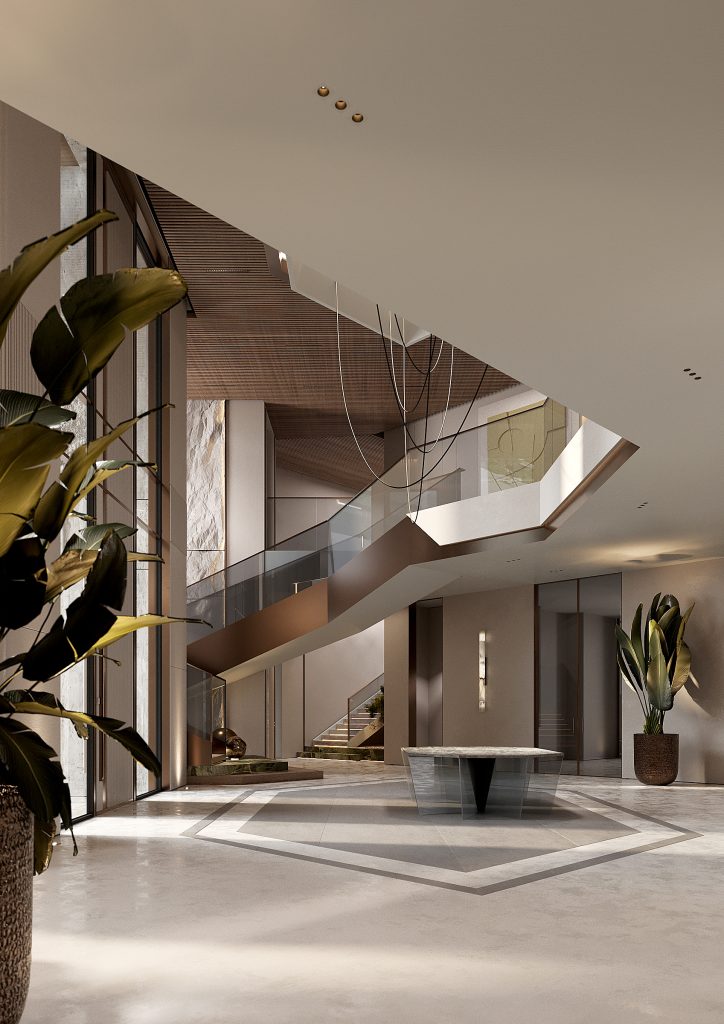 The design features curved architectural details, layered textures, and expansive glass openings, enhancing the sense of openness and elegance. Thoughtfully integrated lighting and artistic accents complete the space, making it a perfect balance of comfort, style, and timeless appeal.