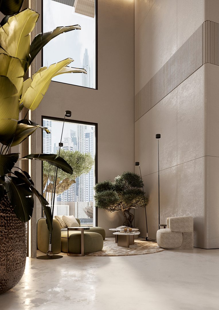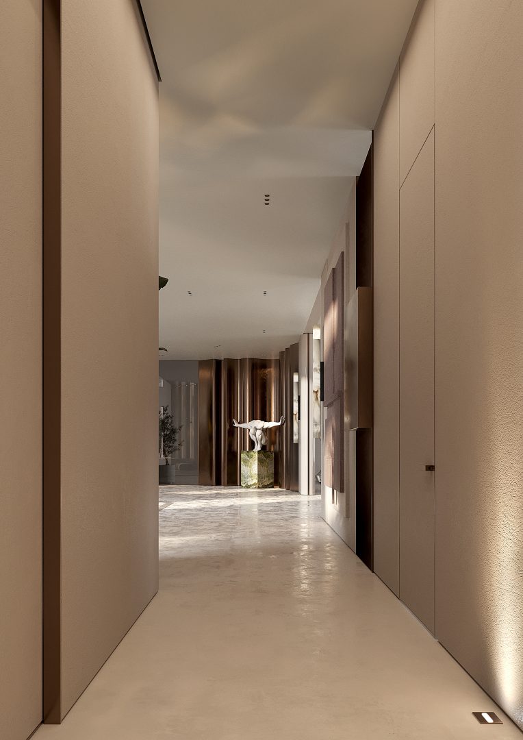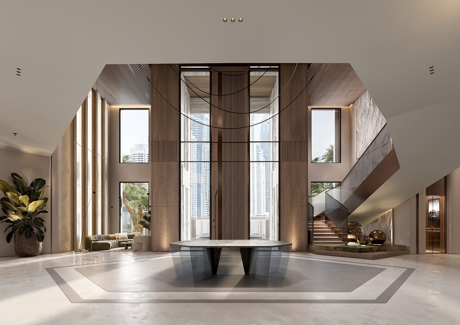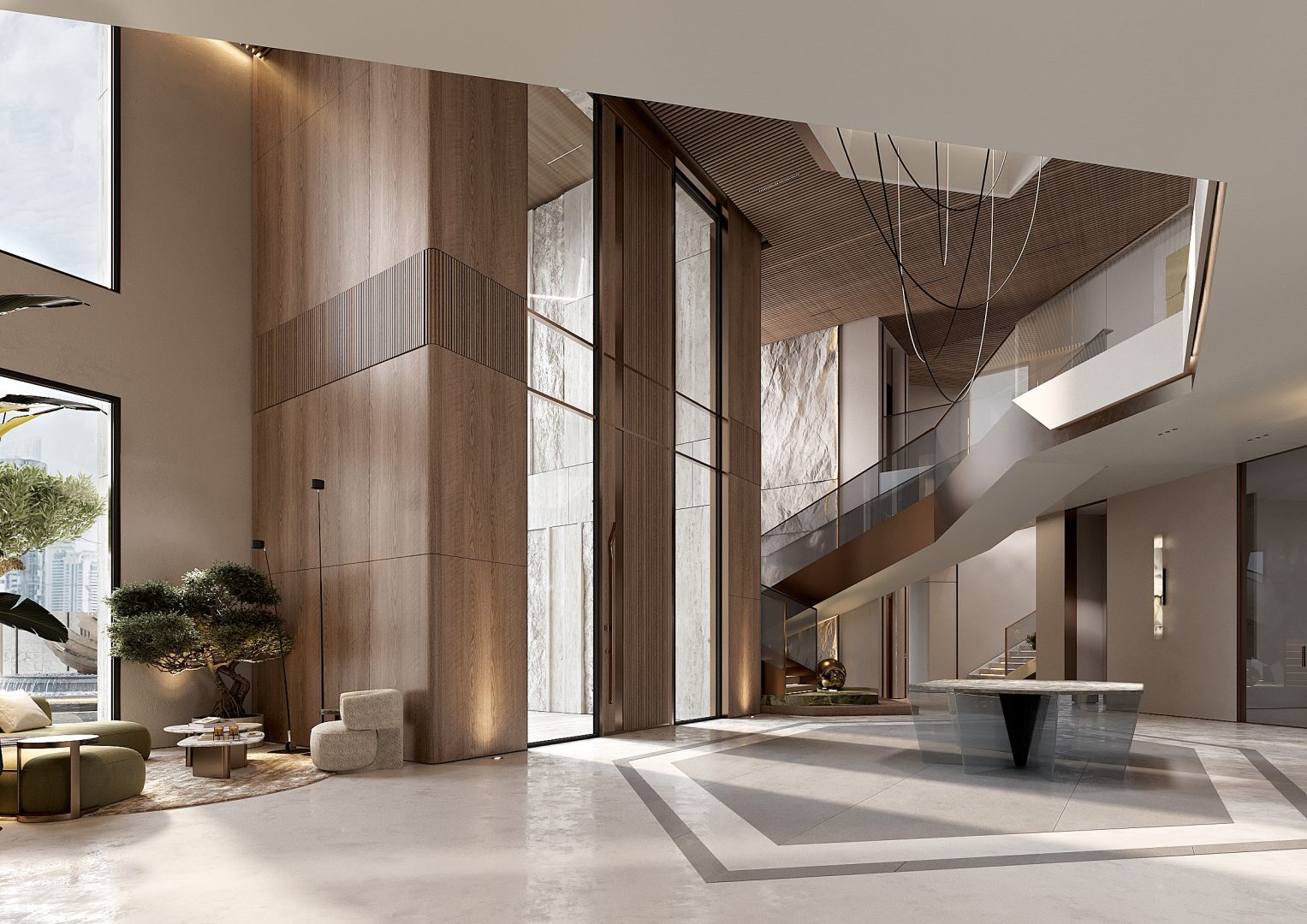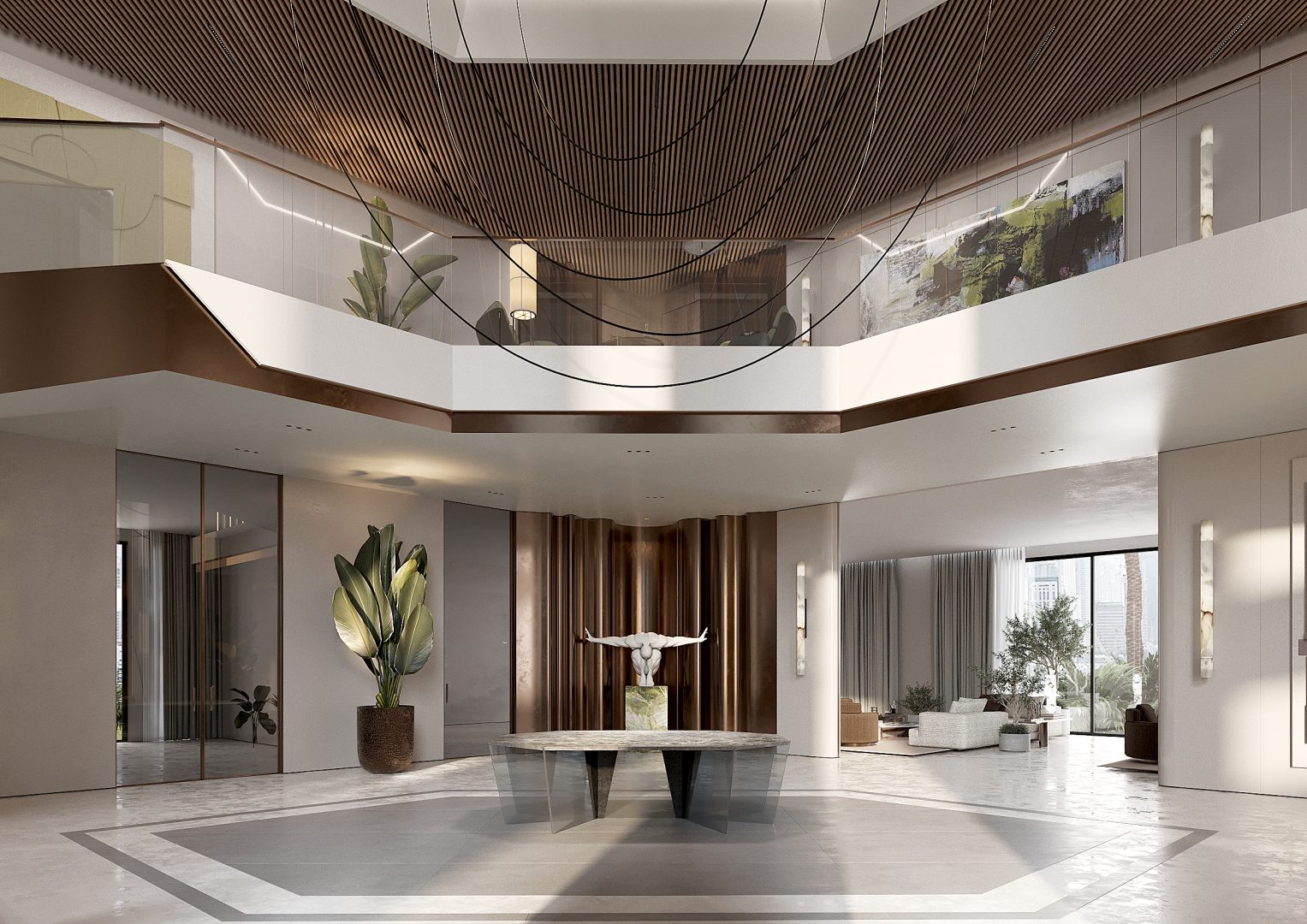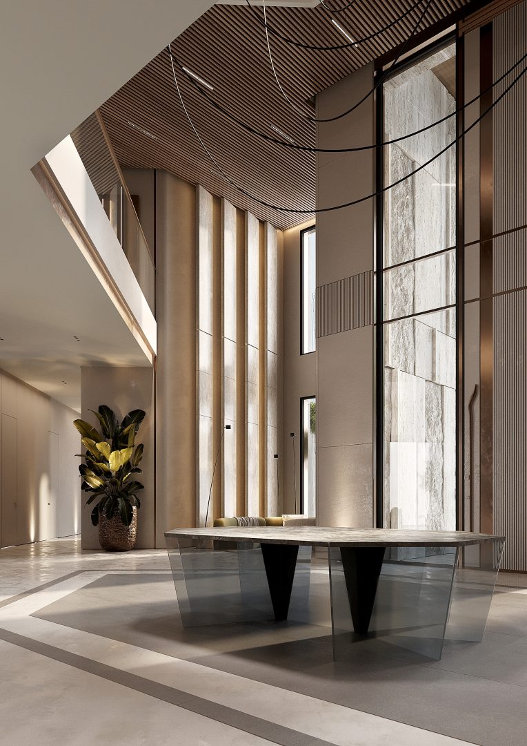 The design features curved architectural details, layered textures, and expansive glass openings, enhancing the sense of openness and elegance. Thoughtfully integrated lighting and artistic accents complete the space, making it a perfect balance of comfort, style, and timeless appeal.