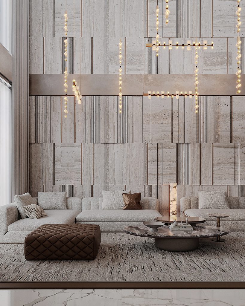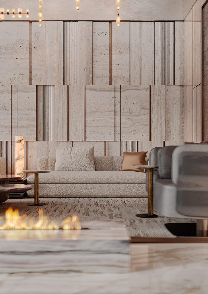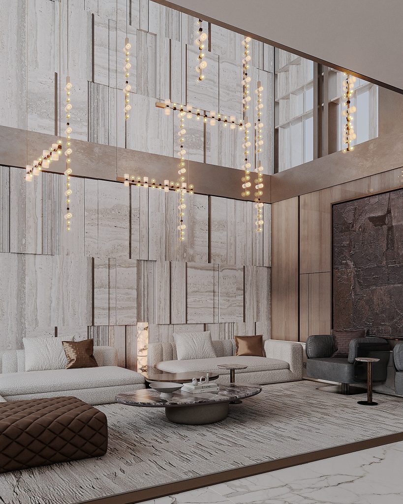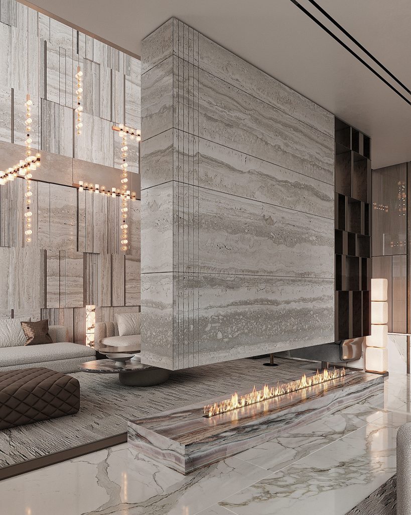 Whispers of Stone & Light is a story written in textures, tones, and subtle contrasts. Here, marble veins flow like brushstrokes, guiding the eye across sculptural walls and a fireplace that glows like liquid gold. Light falls in rhythmic patterns from floating constellations above, turning the living space into a gallery of movement and warmth.