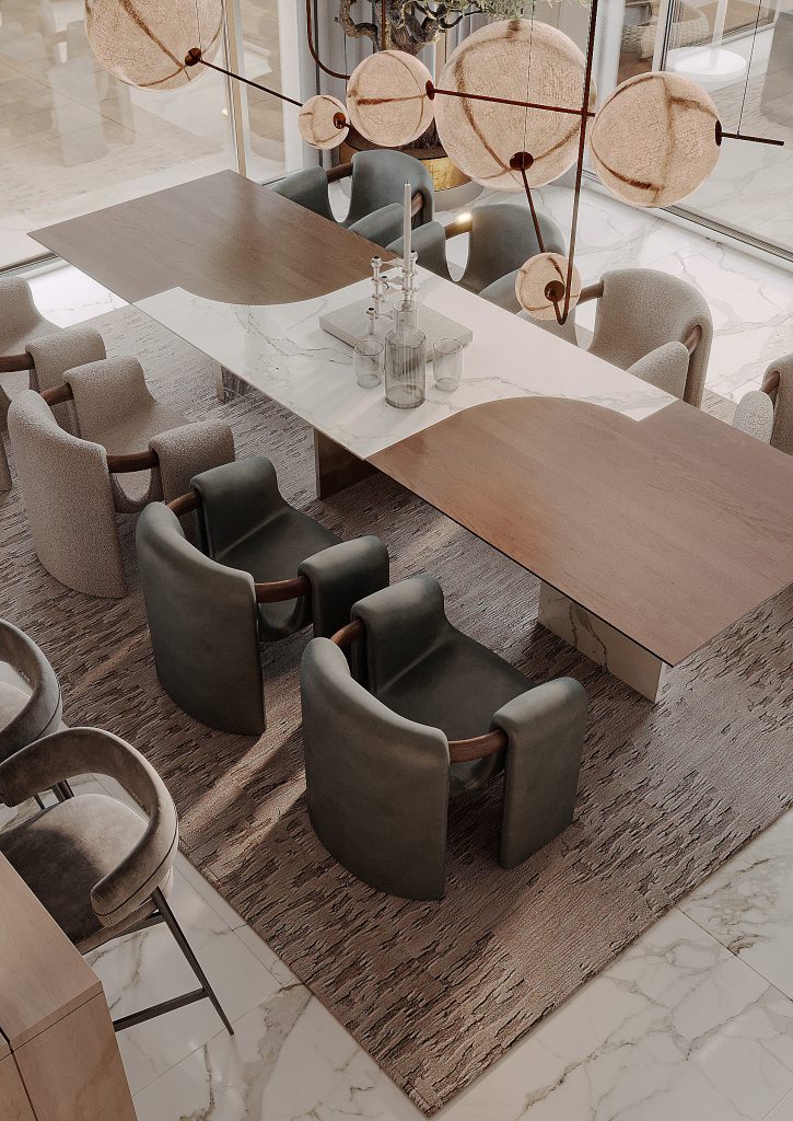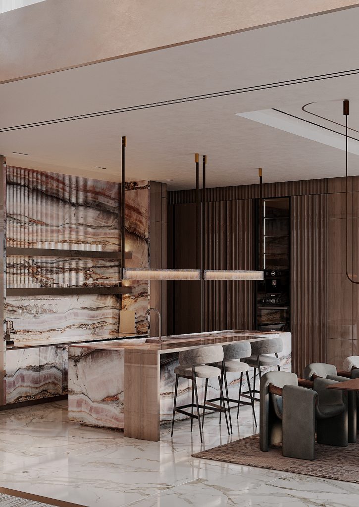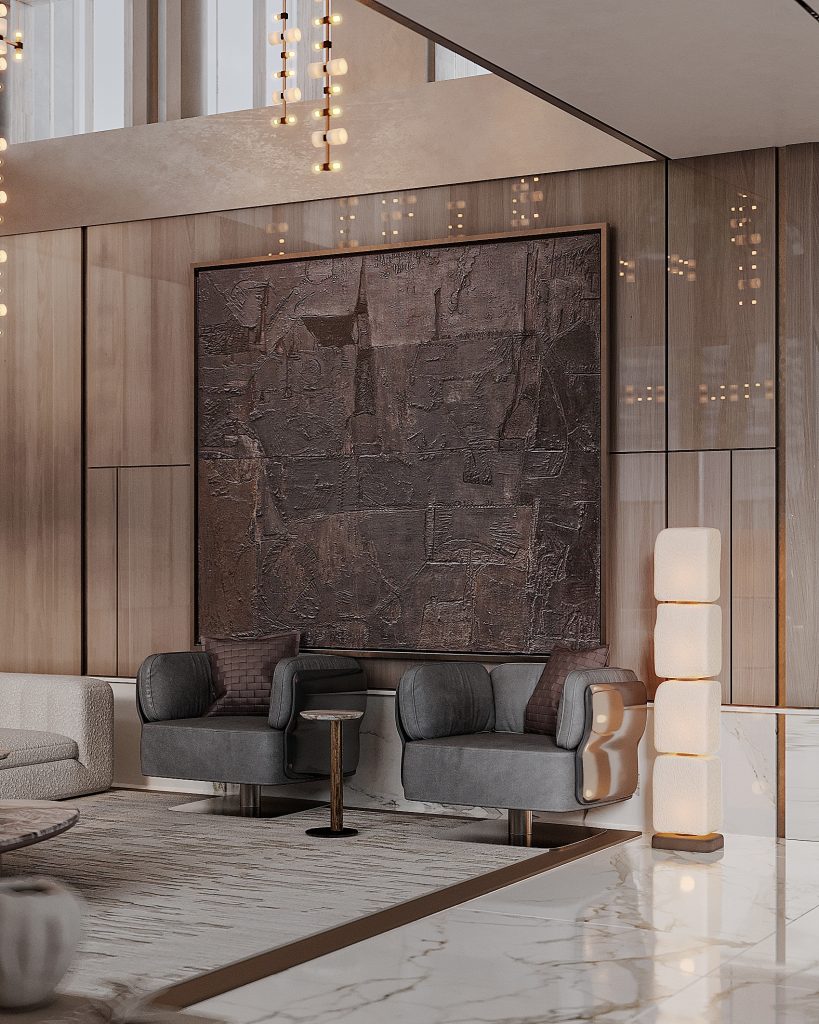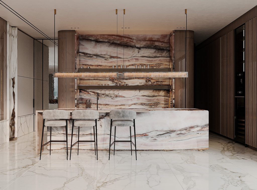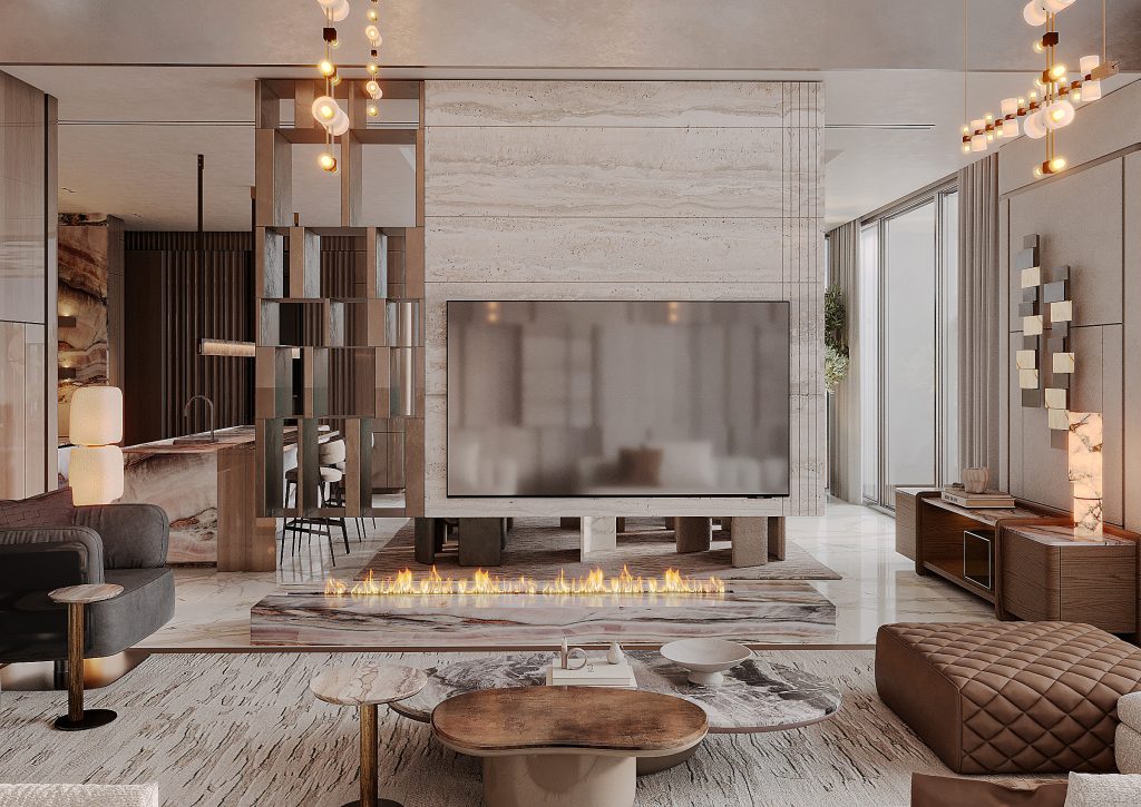 Whispers of Stone & Light is a story written in textures, tones, and subtle contrasts. Here, marble veins flow like brushstrokes, guiding the eye across sculptural walls and a fireplace that glows like liquid gold. Light falls in rhythmic patterns from floating constellations above, turning the living space into a gallery of movement and warmth.