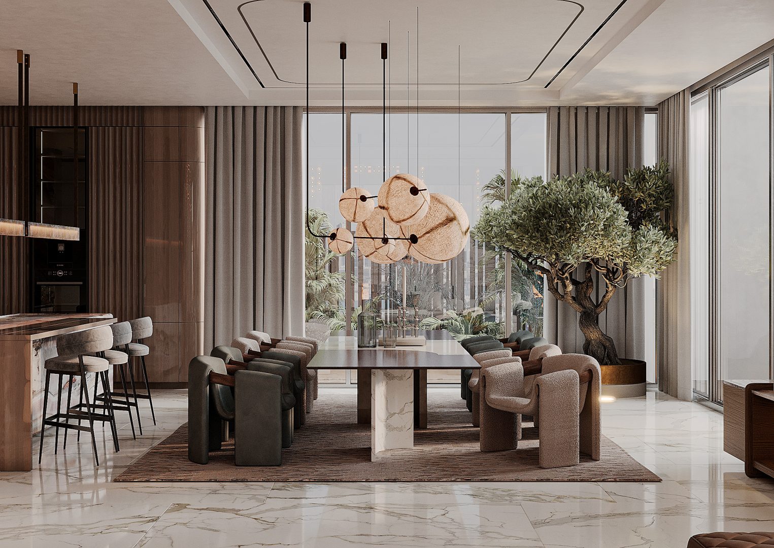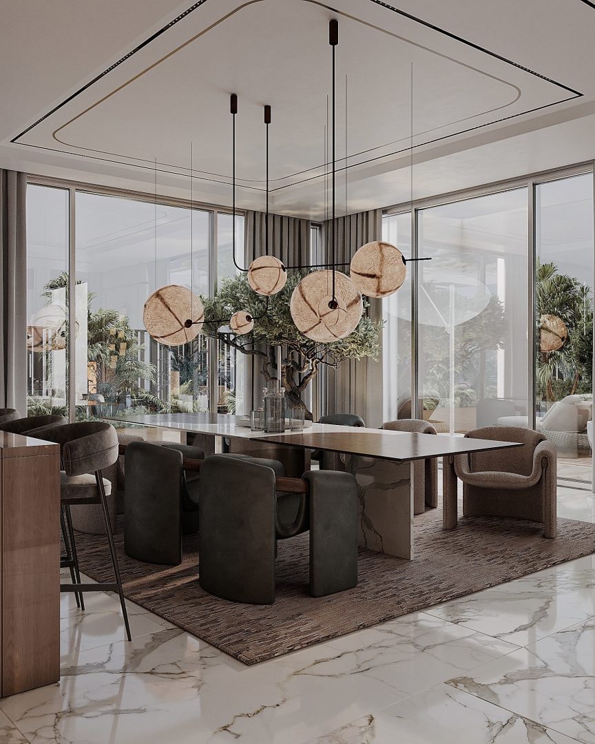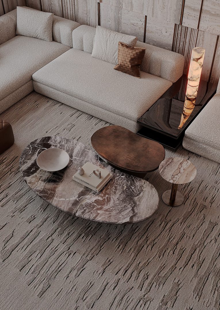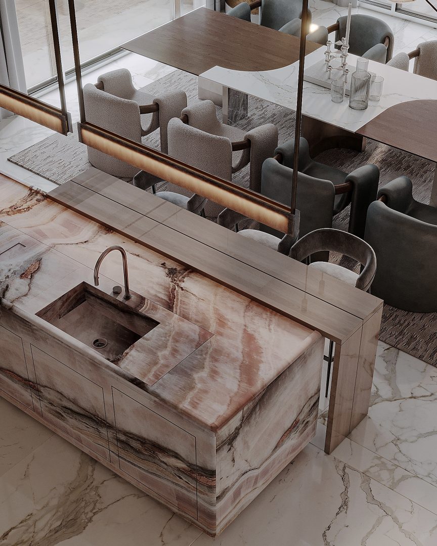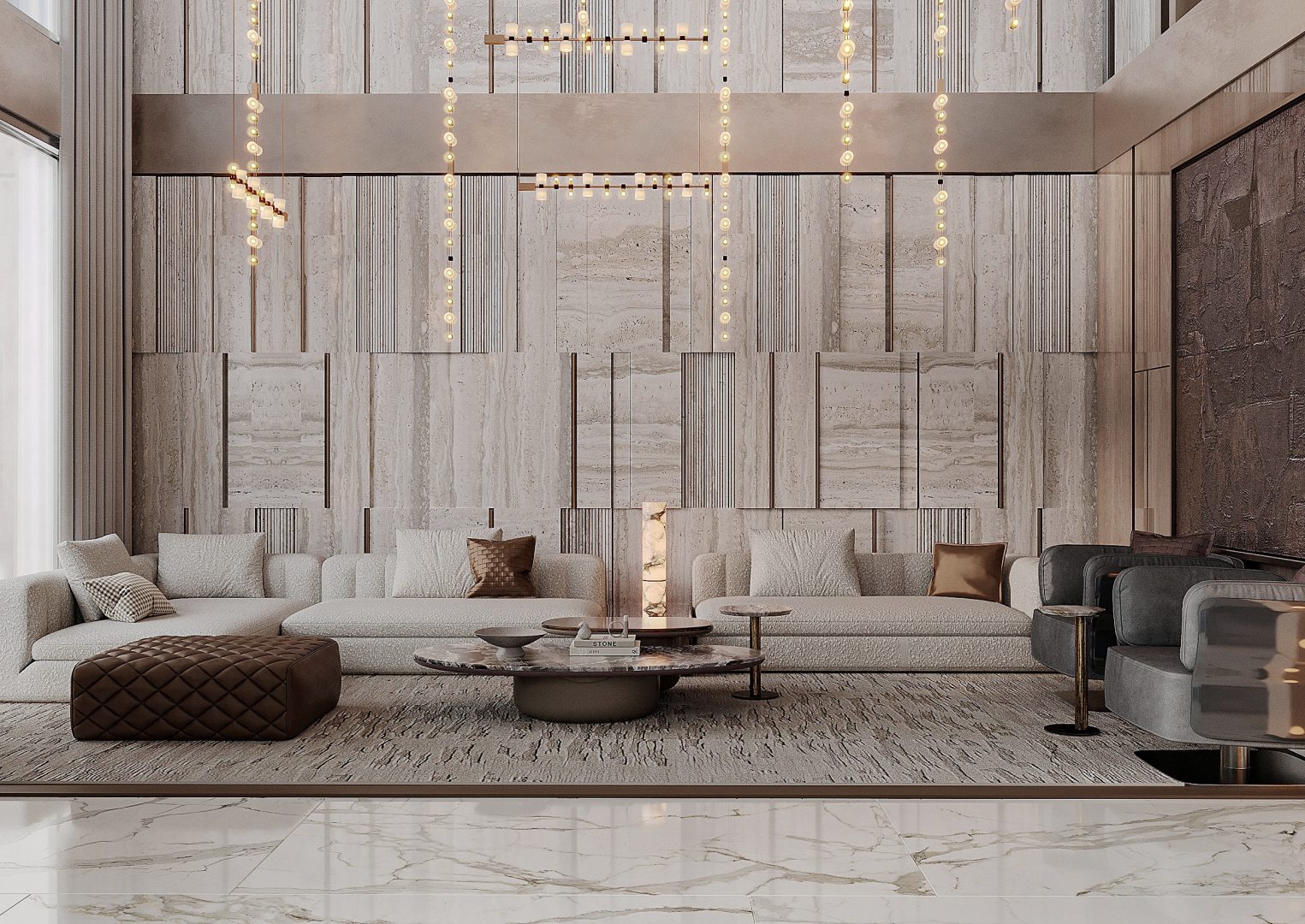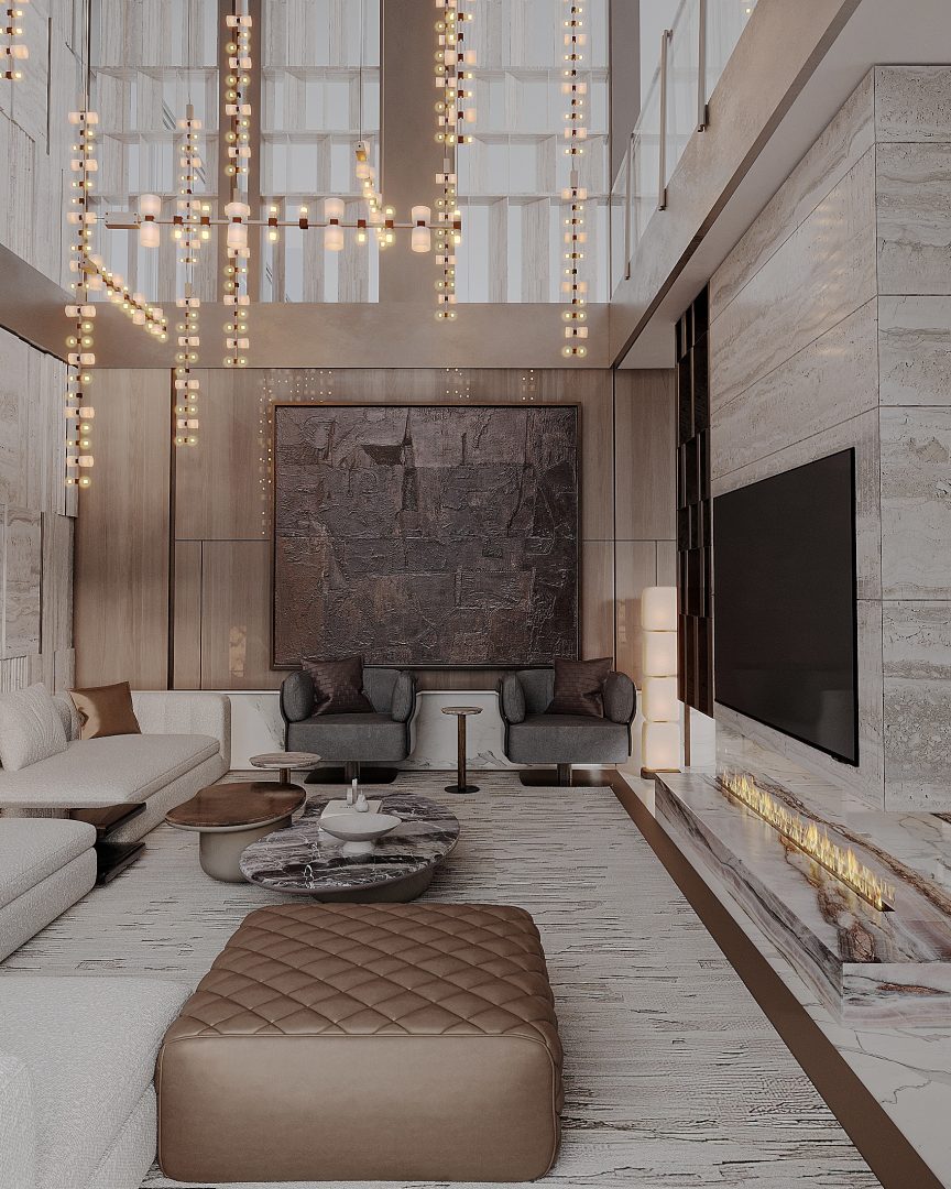 Whispers of Stone & Light is a story written in textures, tones, and subtle contrasts. Here, marble veins flow like brushstrokes, guiding the eye across sculptural walls and a fireplace that glows like liquid gold. Light falls in rhythmic patterns from floating constellations above, turning the living space into a gallery of movement and warmth.