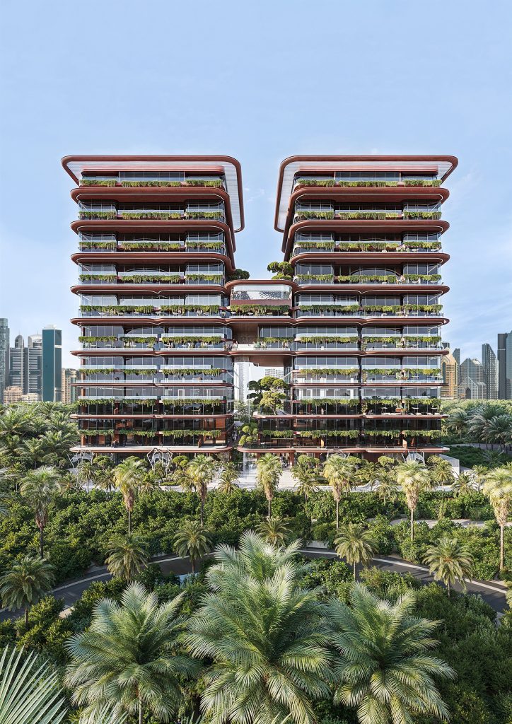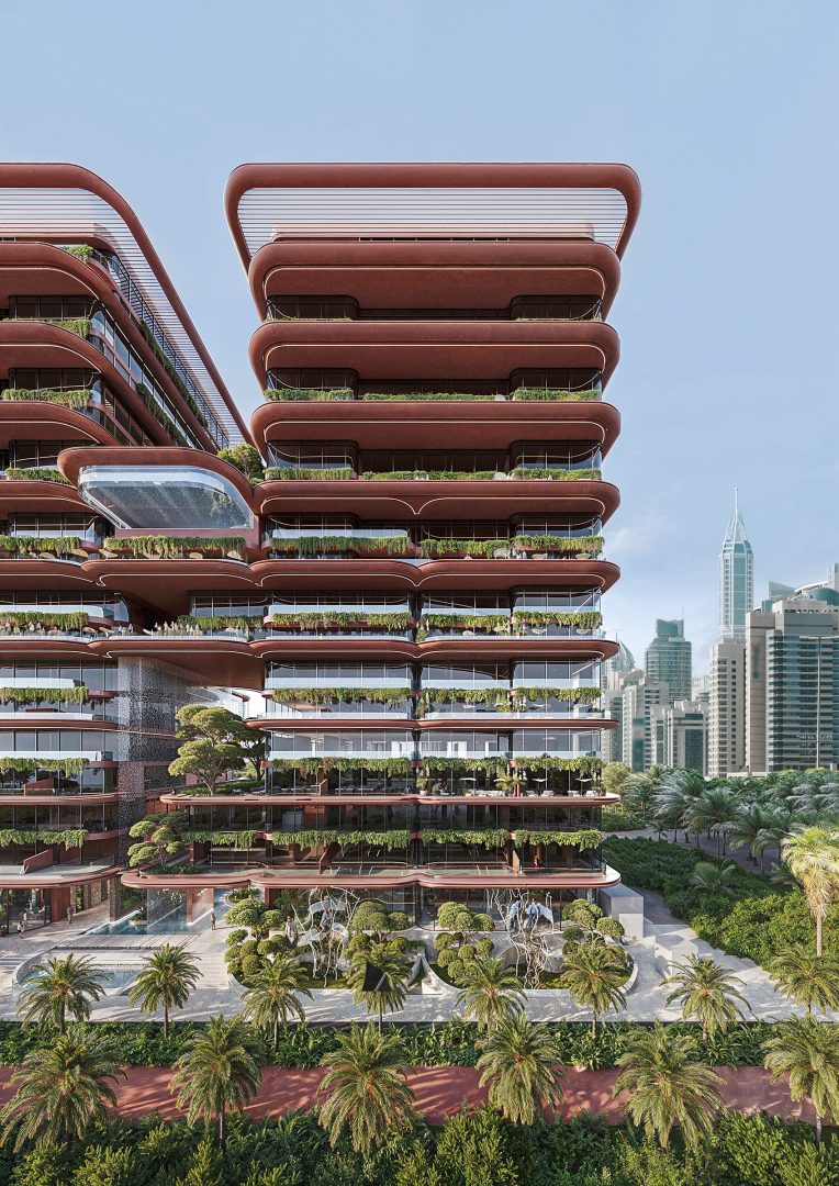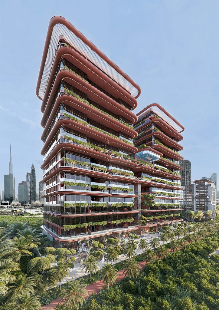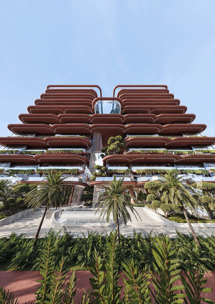 The warm terracotta-toned facade contrasts with lush greenery cascading from the balconies, transforming the tower into a living architectural ecosystem. Integrated planters soften the geometry of the structure and create a natural microclimate, enhancing privacy while reinforcing the connection between urban living and nature.