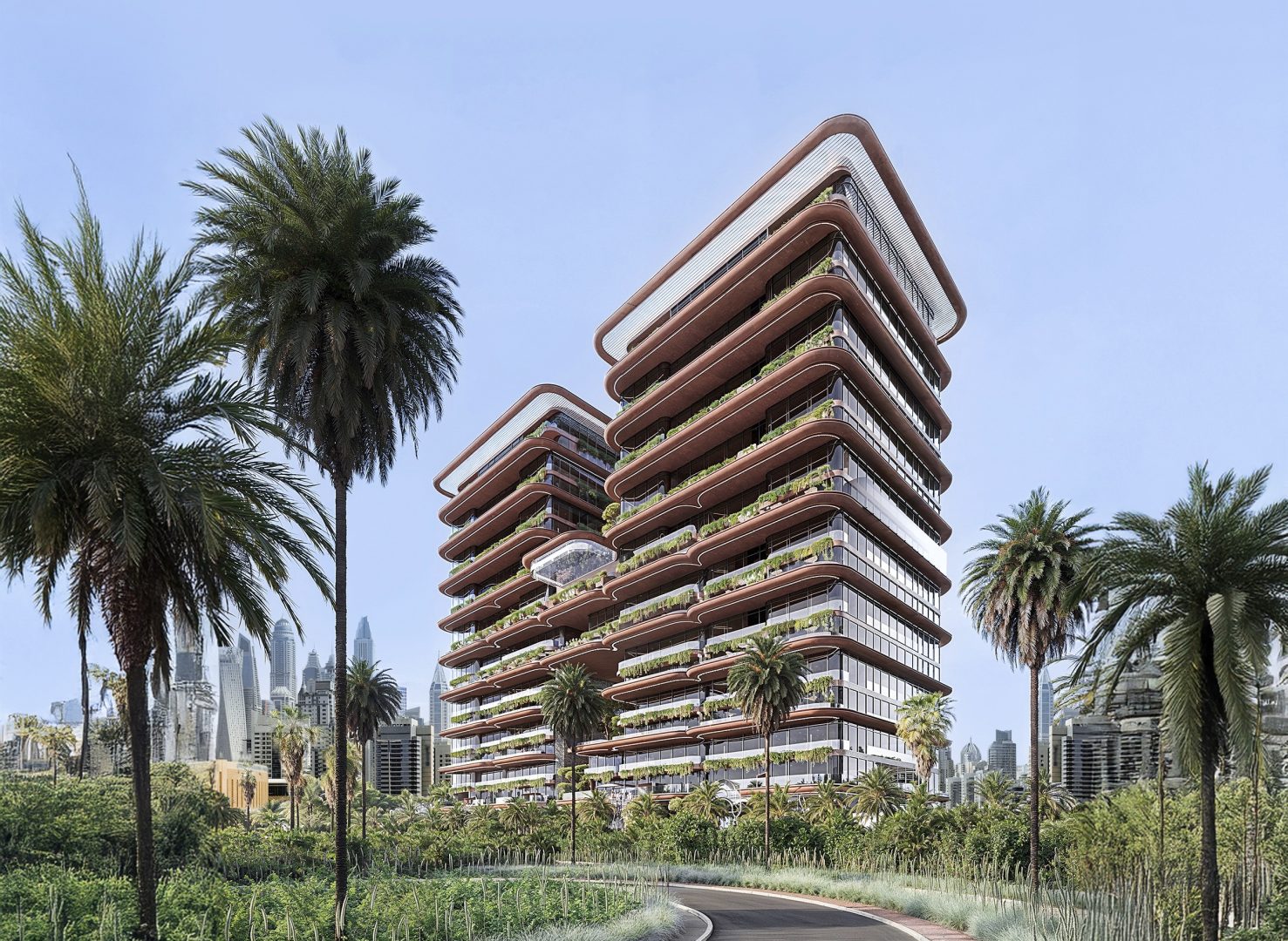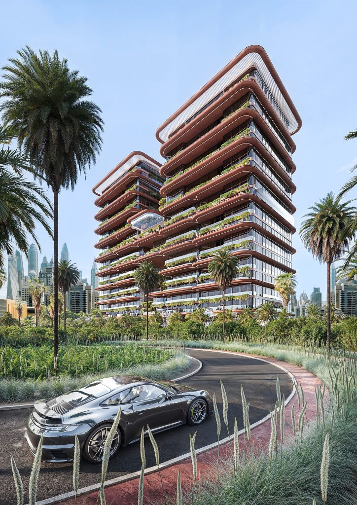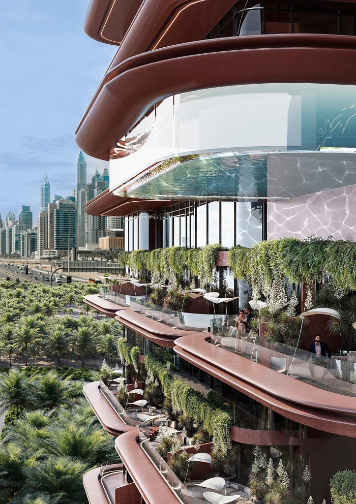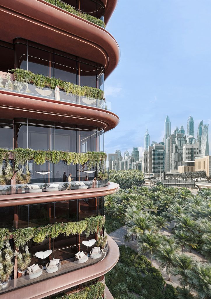 The warm terracotta-toned facade contrasts with lush greenery cascading from the balconies, transforming the tower into a living architectural ecosystem. Integrated planters soften the geometry of the structure and create a natural microclimate, enhancing privacy while reinforcing the connection between urban living and nature.