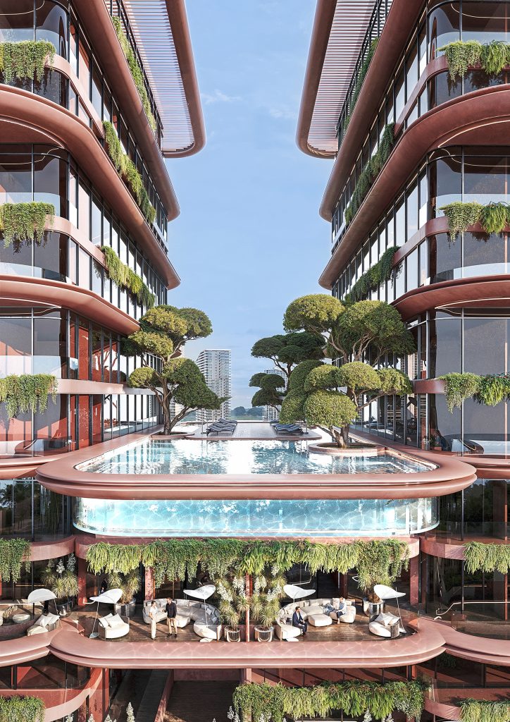 At the heart of the project lies a dramatic elevated pool terrace suspended between the buildings. Surrounded by sculptural trees and panoramic views, this shared oasis becomes a central social space where residents can relax, meet, and experience a resort-like atmosphere within the city.- YEAR: 2026